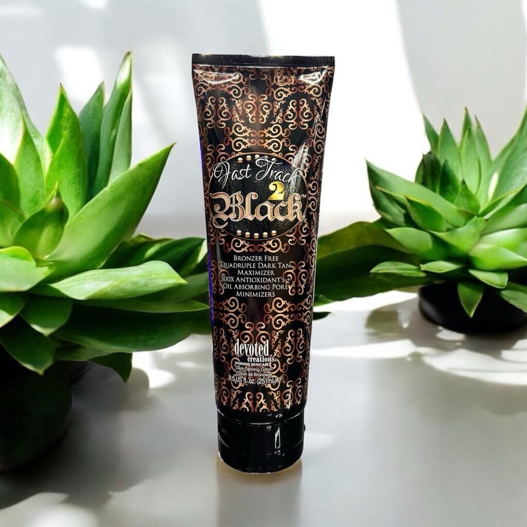 🔥 Fast Track 2 Black is an advanced tanning accelerator that helps achieve an intense, dark tan without bronzers. Featuring Quadruple Dark Tan Maximizer technology, it enhances your natural tan for long-lasting, deep color. Infused with 300x more antioxidants, it protects the skin from aging while minimizing pores and absorbing excess oil.